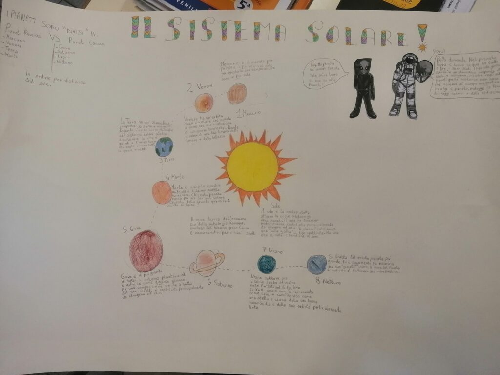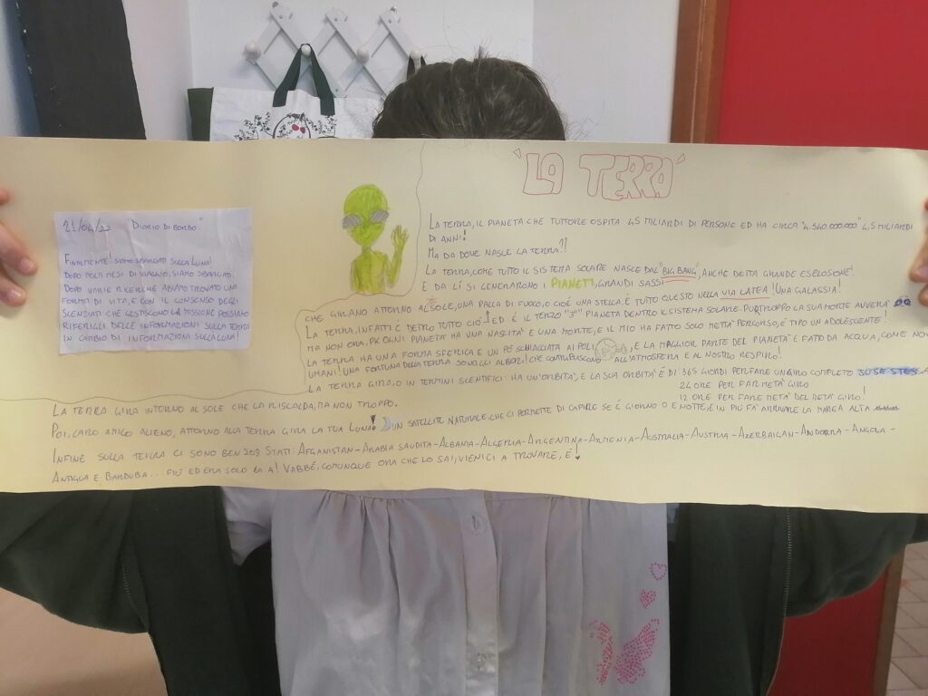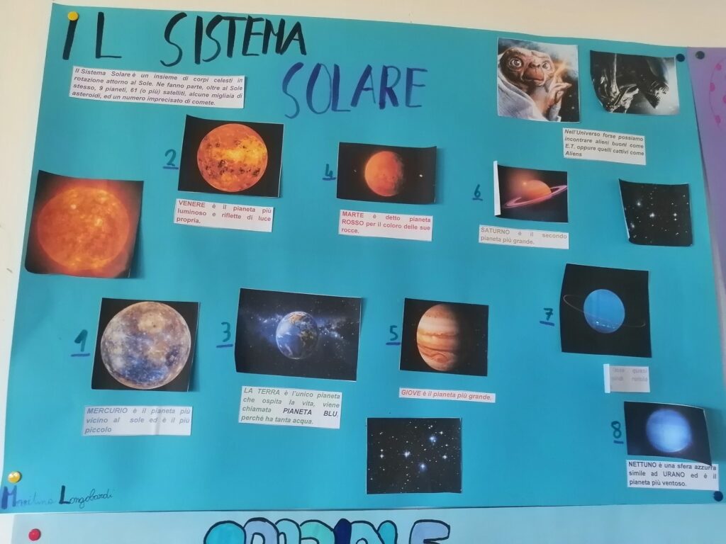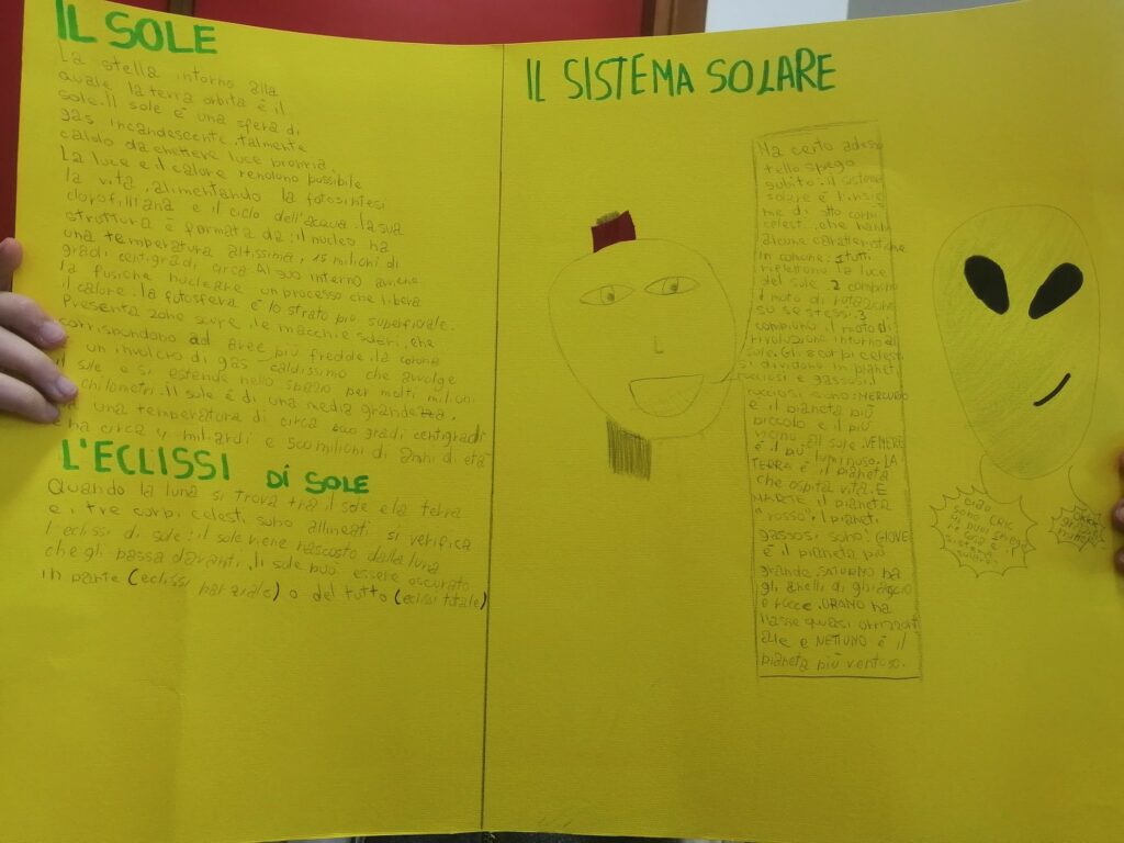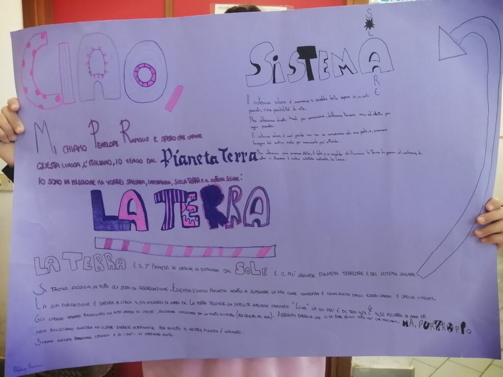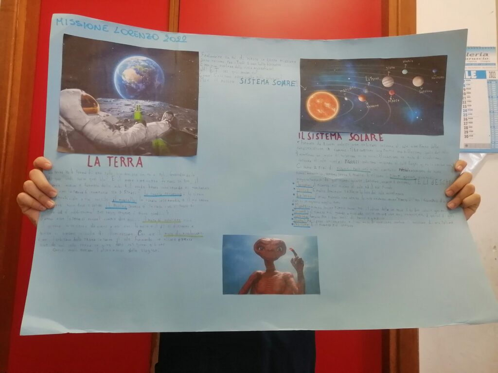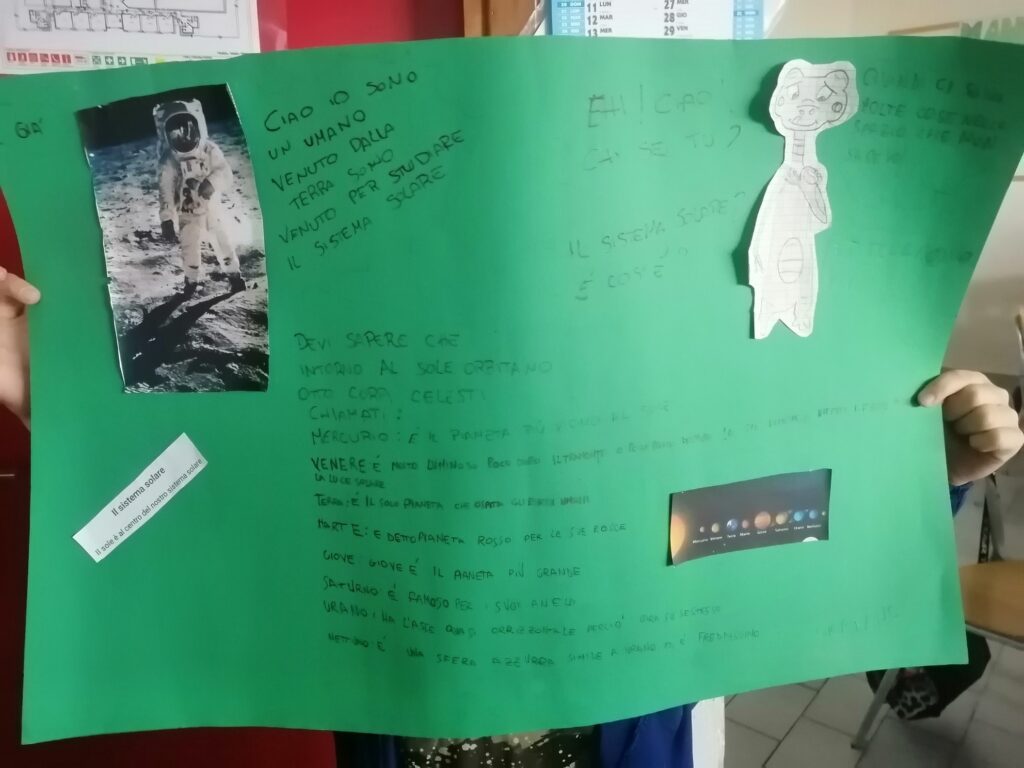 Nella classe 5C c’è una missione spaziale in partenza con il compito di trasportare informazioni riguardanti il Pianeta Terra e il Sistema Solare perché potrebbe incontrare altre forme di “vita intelligente”. Ogni alunno è stato scelto per preparare un cartellone attraverso il quale deve comunicare con queste forme di vita…