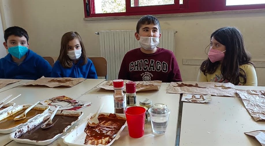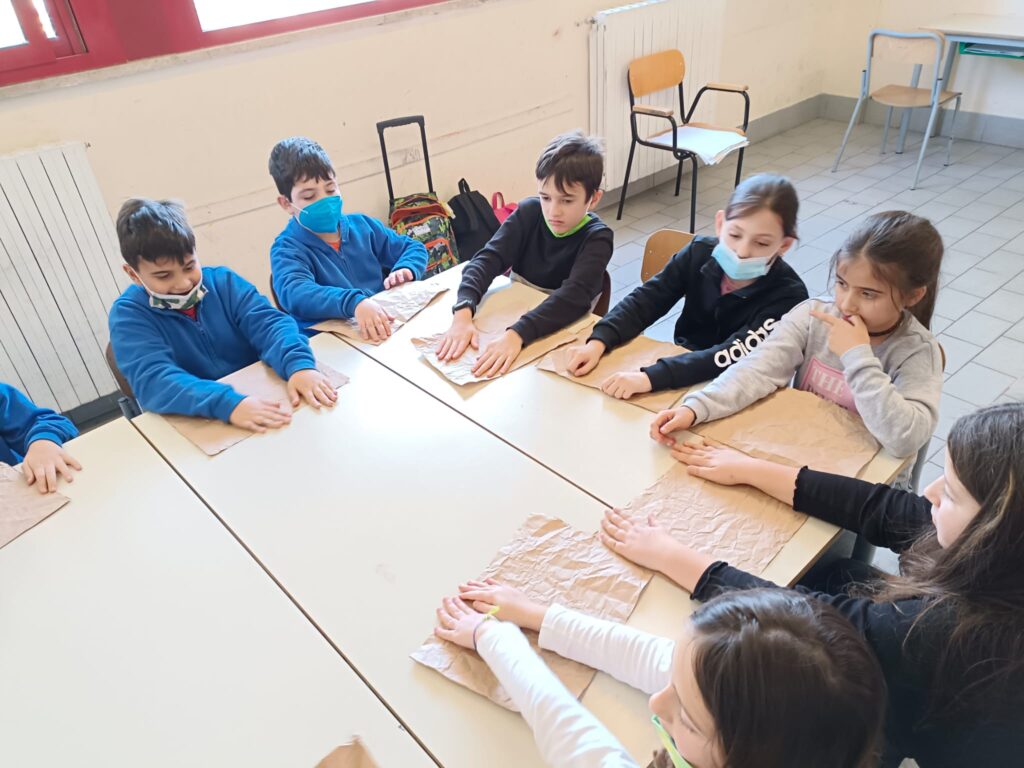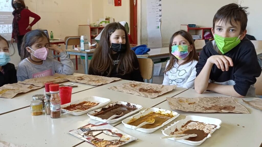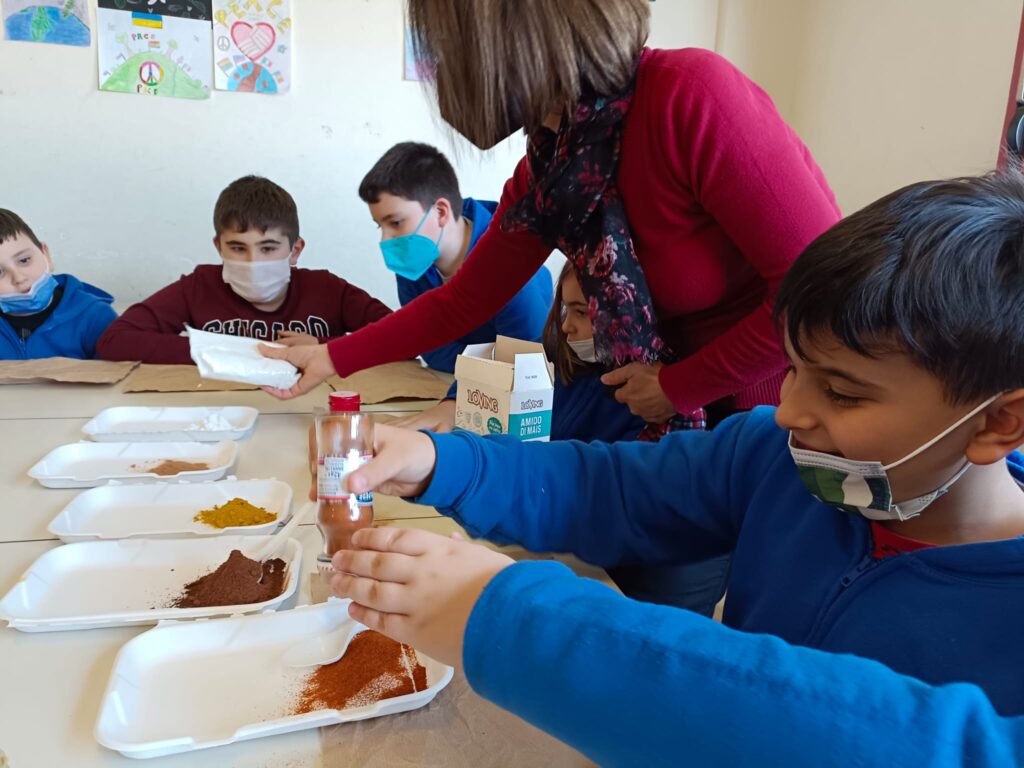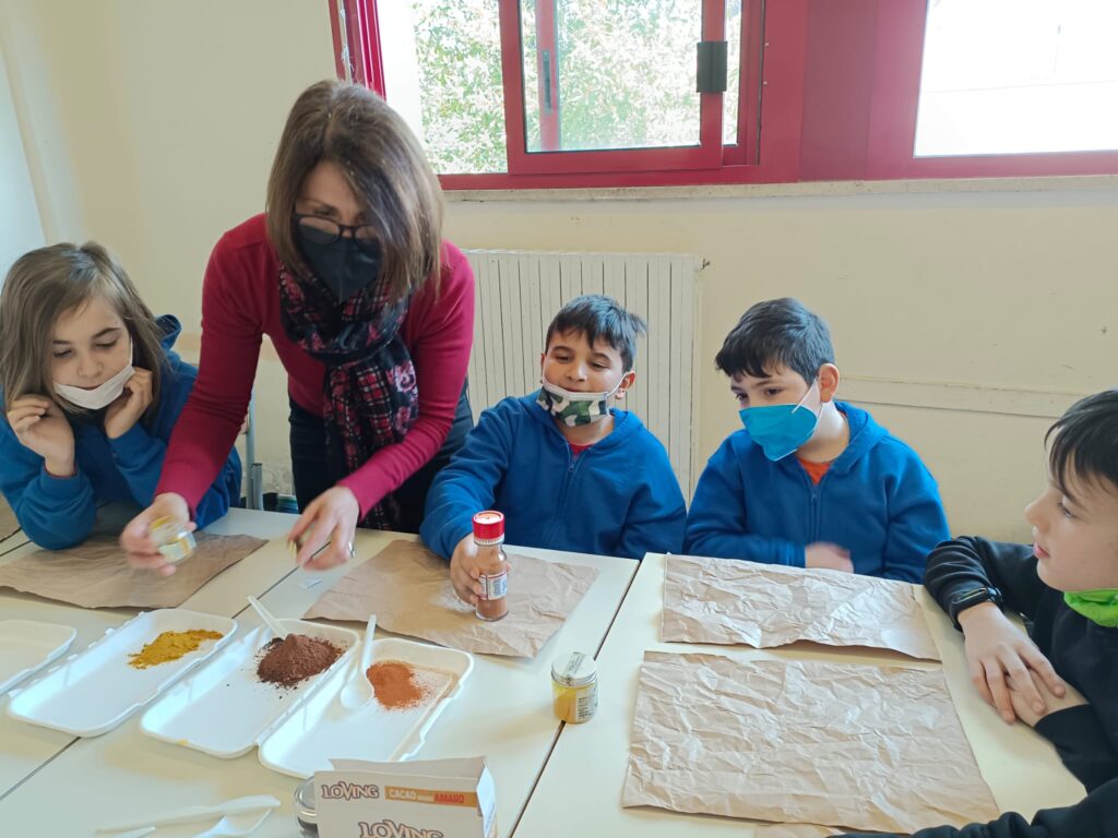 La maestra ci ha allora guidato nel realizzare le nostre “pitture rupestri” utilizzando carta roccia e colori ricreati da noi partendo da polveri di vari colori. Che divertimento… e che profumo!