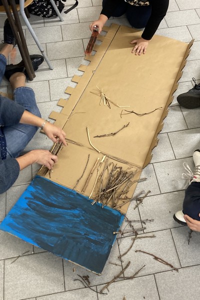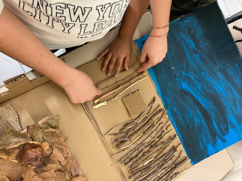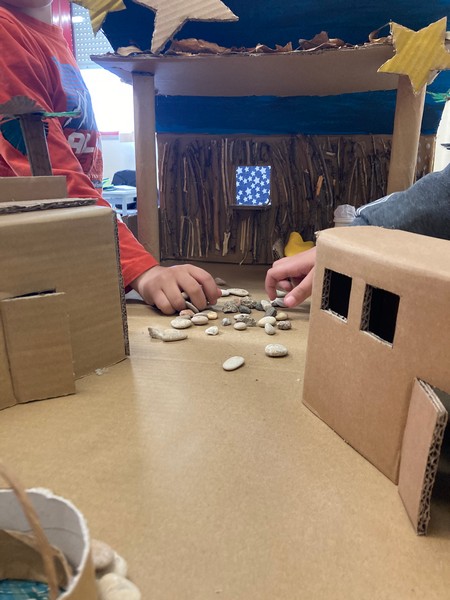 I bambini hanno dipinto alcune parti, come il cielo, le stelle e le mura intorno, ma non tutto perché abbiamo preferito lasciare colori naturali.
