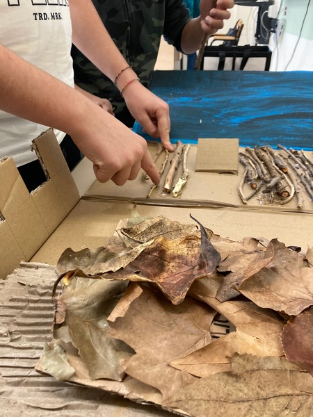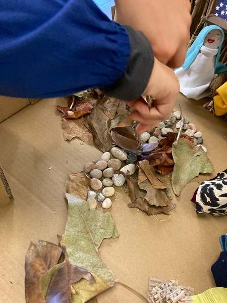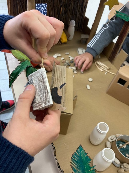 Seconda fase: i bambini hanno portato a scuola materiali di riciclo quali cartoni delle uova, bottigliette in plastica dello yogurt, l’interno di rotoli di carta igienica, della carta assorbente e della pellicola/alluminio, scatole vuote dei cereali, foglie secche e rametti vari, sassolini e ritagli di stoffa. Con questi materiali hanno iniziato a fantasticare su cosa potessero diventare all’interno del presepe ed è stata la fase più entusiasmante!