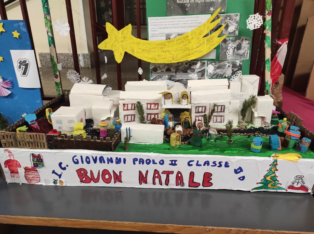 Il nostro presepe vuole interpretare la volontà di portare nella nostra quotidianità, dentro casa , nei luoghi di gioco e di lavoro, questo messaggio.