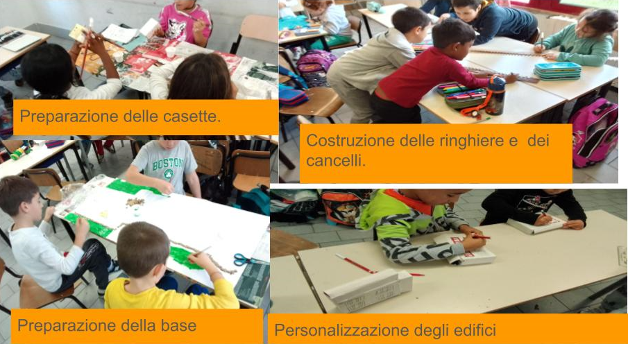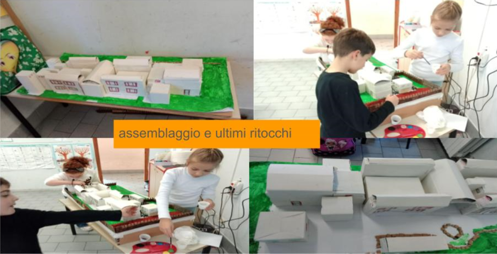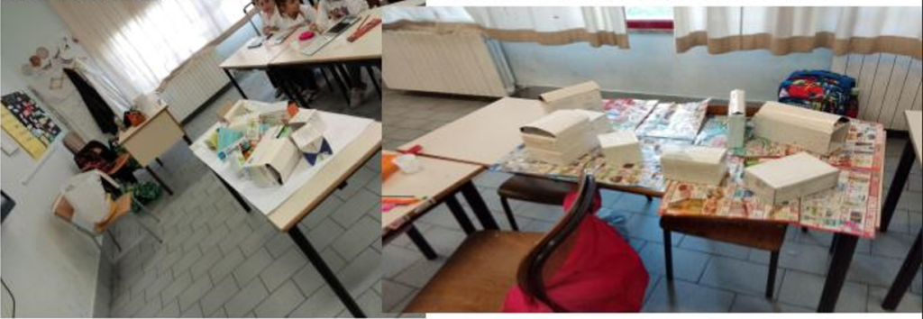 Cartone, scatolette di medicinali, di creme e di biscotti per la realizzazione della struttura del plastico.