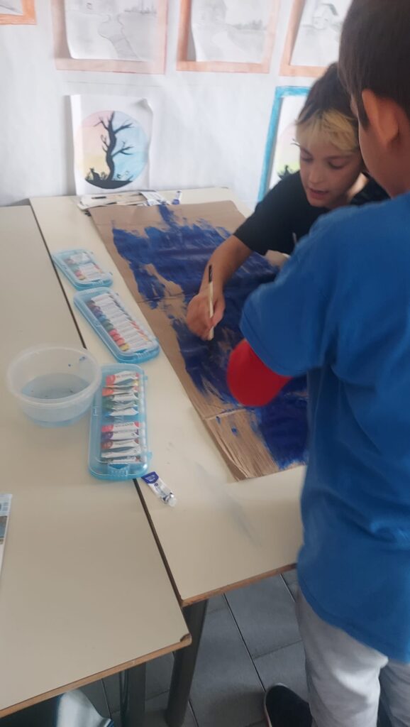 Sempre con la carta più sottile un gruppo di bambini ha dipinto con il verde ed il marrone le montagne, mentre altri hanno realizzato i vari personaggi e alberelli.