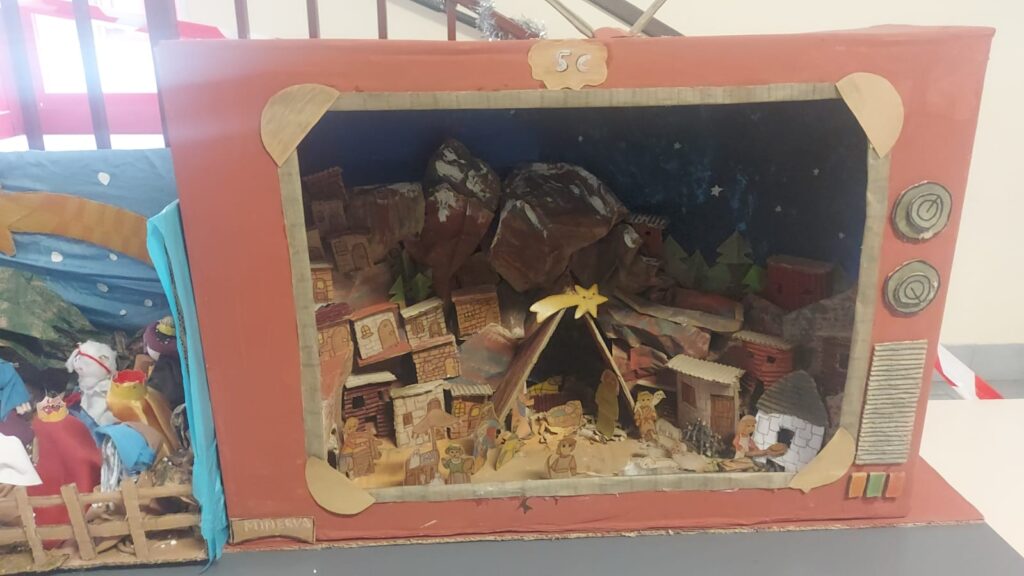 Abbiamo deciso alla fine di trasformare il cartone in un presepe all’interno di una tv.