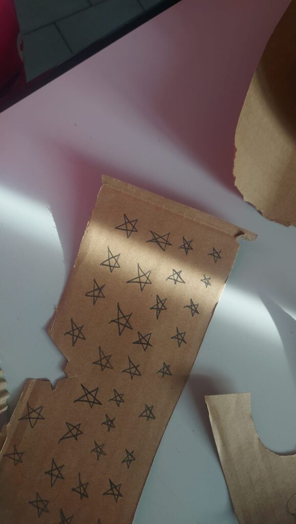 Poi abbiamo “spellato” l’altra parte del cartone per realizzare il cielo; questo ci è servito per dare una forma piu’ concava nella parte posteriore del televisore, al cielo sono state aggiunte le stelline disegnate e ritagliate.